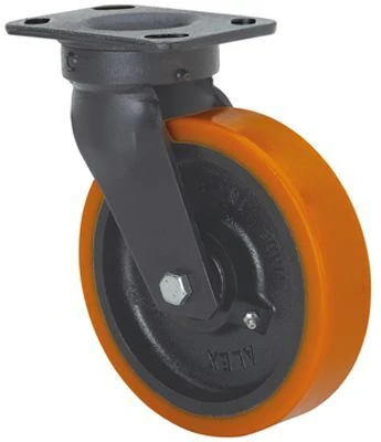 Roulettes à noyau en acier et bande de polyuréthane fondu avec une dureté de 95 º shore A, indiquées spécialement pour supporter de fortes charges jusqu'à 1 250 kg.