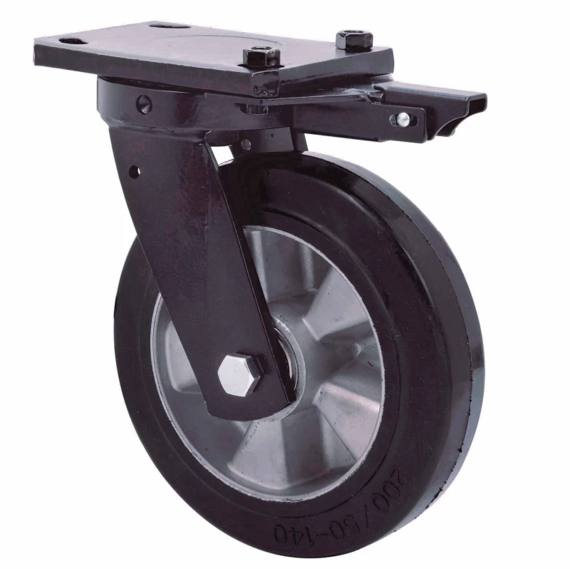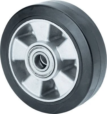 Rouettes à noyau en aluminium et élastique en nylon noir avec une dureté de 70˚ shore A. Indiquées spécialement pour supporter des charges jusqu'à 500 kg.