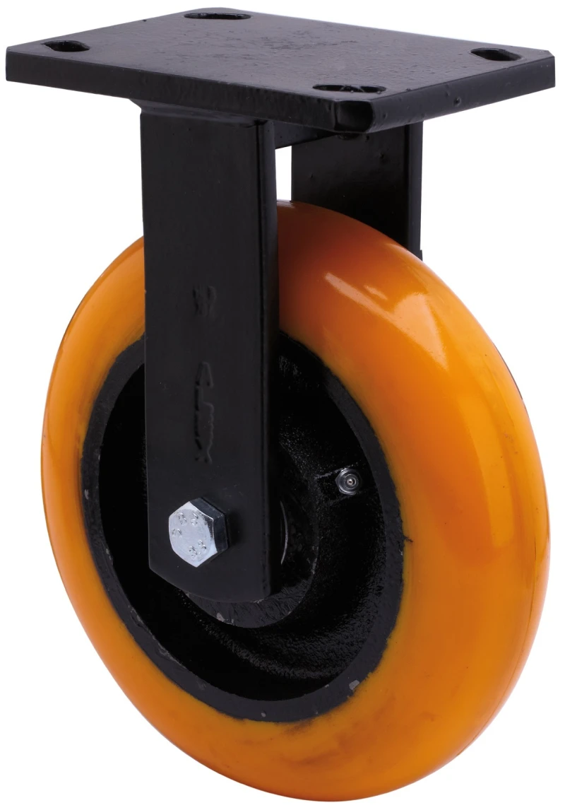 Roulettes à noyau en acier et bande de polyuréthane fondu avec dureté 95º shore A avec bande de roulement en forme de balona, indiquées spécialement pour supporter de fortse charges jusqu'à 800 kg.