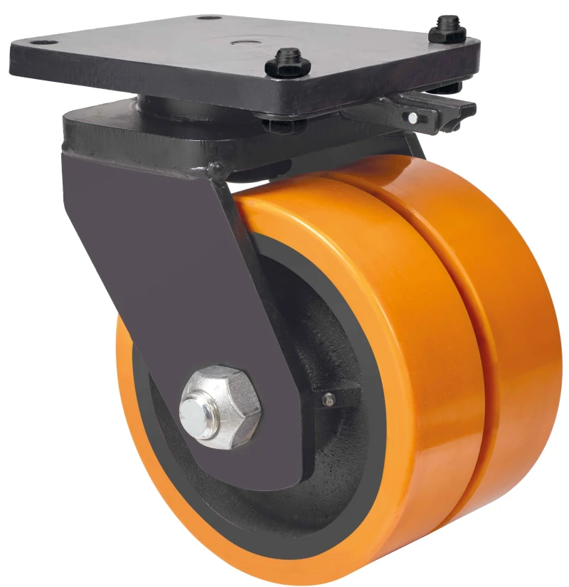 Roulettes double à noyau en acier et bande en polyuréthane fondu avec dureté 95º shore A, indiquées pour supporter de très fortes charges jusqu'à 4 000Kg.
