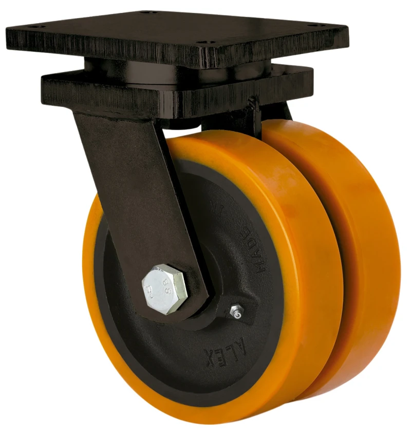 Roulette double à noyau en acier et bande de polyuréthane fondu avec dureté de 95° shore A, indiquées spécialement pour supporter de fortes charges jusqu'à 2 500 kg.