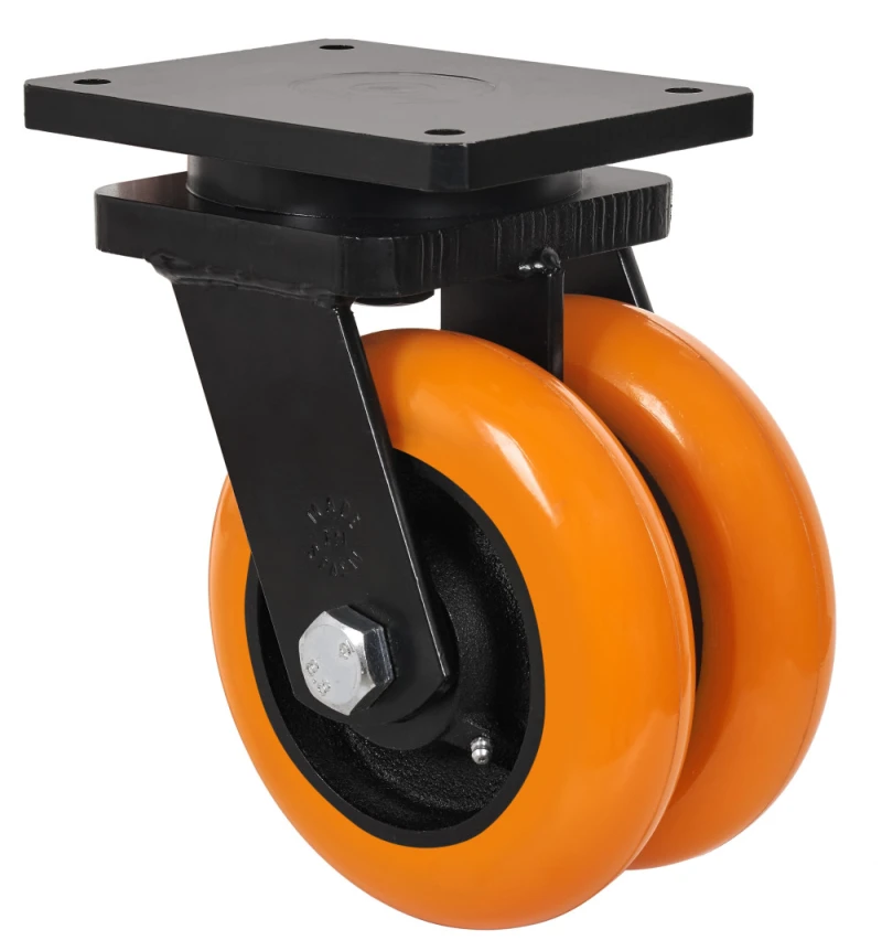 Roulette double à noyau en acier et bande de polyuréthane fondu avec dureté de 95° shore A, indiquées spécialement pour supporter de fortes charges jusqu'à 1.600 kg.