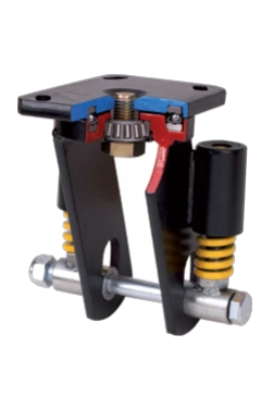 Roulettes à noyau en acier et bande en polyuréthane fondu avec dureté de 95° shore A, indiquées spécialement pour supporter de fortes charges jusqu'à 1 250 Kg. Avec un support de suspension flexible avec incorporation d'un ressort très résistant, idéale sur sols irréguliers où son amortissement est optimal.