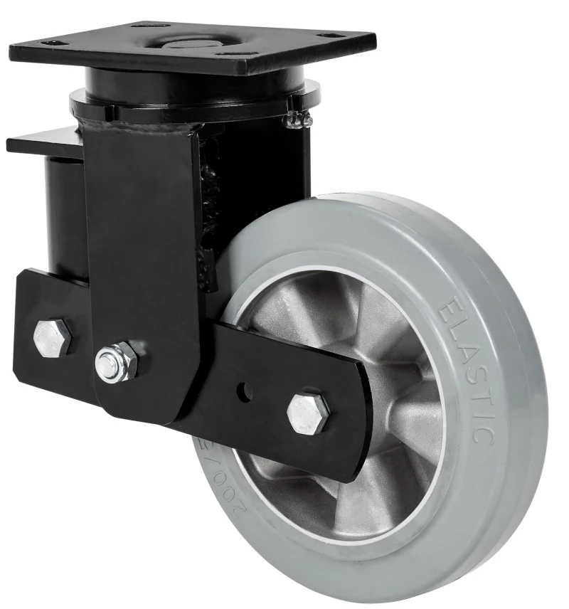 Roulettes avec corps en aluminium et bandage en caoutchouc élastique gris d'une dureté de 70º shore A. Particulièrement adaptée pour supporter de fortes charges allant jusqu'à 450 Kgs. Avec un support élastique grâce à l'incorporation de ressorts très résistants pour absorber les coups, chocs et irrégularités. Course du ressort jusqu'à 25mm. idéal sur les sols irréguliers où son amortisation agit.