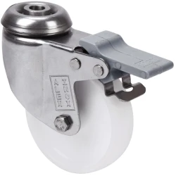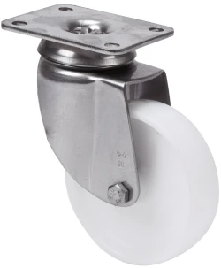 Roulettes en polypropylène blanc, avec tous ses composants en acier inoxydable (AISI 304). Indiquées spécialement pour supporter des charges jusqu'à 80 kg.