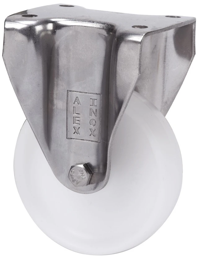 Roulettes en polypropylène blanc, avec tous ses composants en acier inoxydable (AISI 304). Indiquées spécialement pour supporter des charges jusqu'à 80 kg.