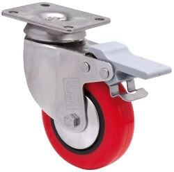 Roulettes en polyuréthane injecté avec noyau en polypropylène avec tous ses composants en acier inoxydable (AISI 304). Indiquées pour supporter des charges jusqu'à 80 kg.
