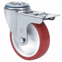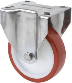 Roulettes en polyuréthane injecté avec tous ses composants en acier inoxydable (AISI 304). Indiquées spécialement pour supporter des charges jusqu'à 300 kg.