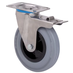 Roulettes en caoutchouc naturel gris avec tous ses composants en acier inoxydable (AISI 304). Indiquées spécialement pour supporter des charges jusqu'à 215 kg.