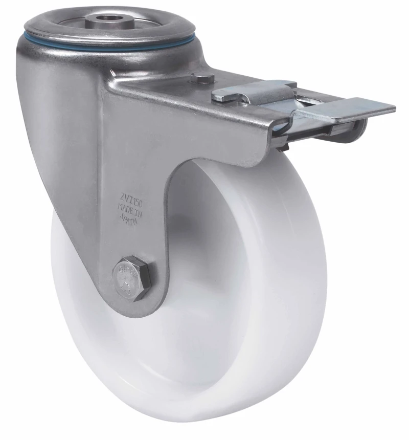 Roulettes en polypropylène blanc avec tous ses composants en acier inoxydable (AISI 304). Indiquées spécialement pour supporter des charges jusqu'à 400 kg.