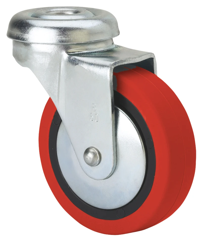 Roulettes rouges en polyuréthane injecté doux utilisées spécialement pour supporter des charges jusqu'à 40 kg.