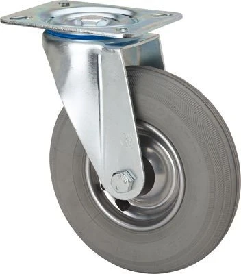 Roues et roulettes pneumatiques série ZV-RIL gris, de bandaje élastique plein, anti-crevaison, avec une jante métallique, pour usage intérieur, pour chariots de transport, transport d'outils. Supportent des charges jusqu'à 75 kg. Silencieuces, ne laissent pas de traces au sol.