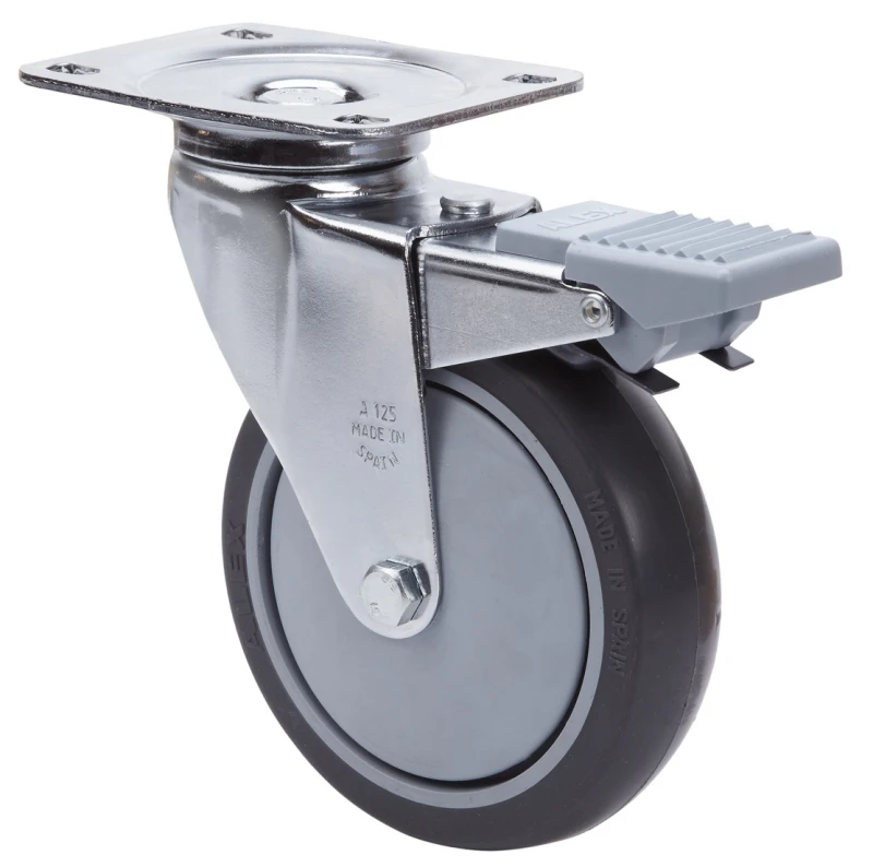 Roulettes à noyau en polypropylène et bande en caoutchouc gris thermoplastique. Indiquées spécialement pour supporter des charges jusqu'à 100 kg.
