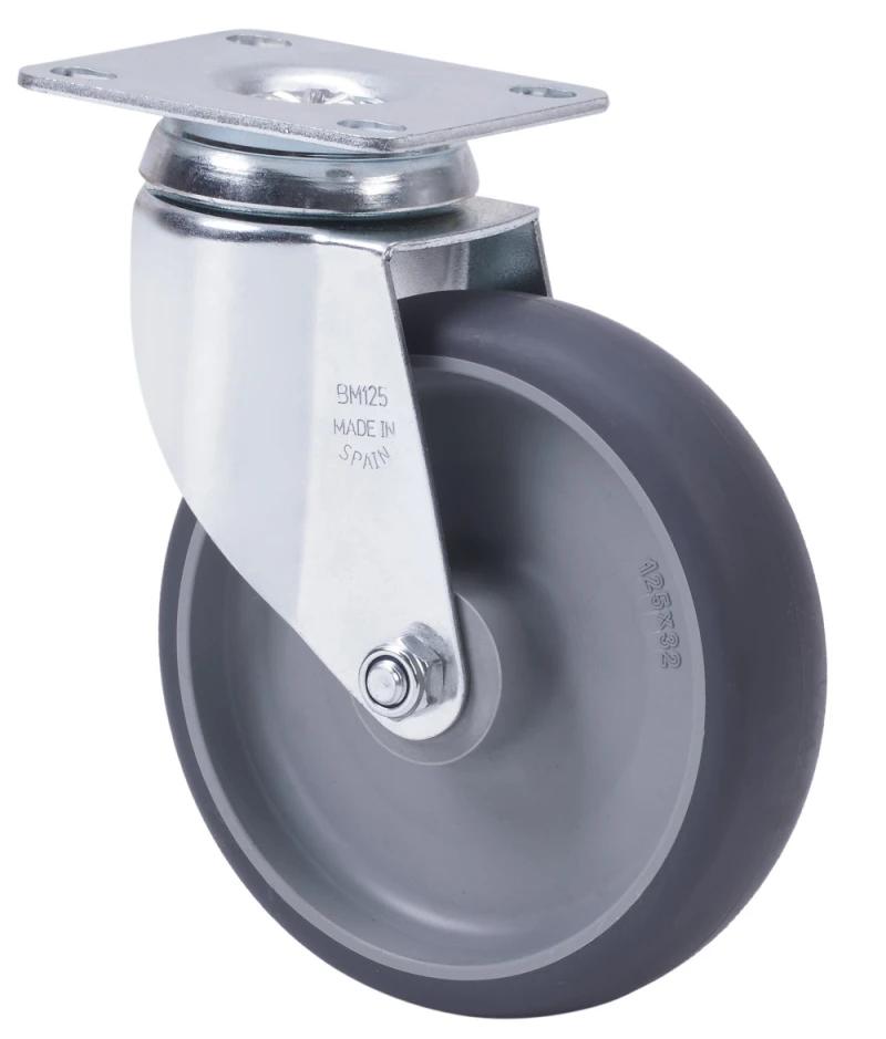 Roulettes en caoutchouc gris injecté. Indiquées spécialement pour supporter des charges jusqu'à 90 kg.