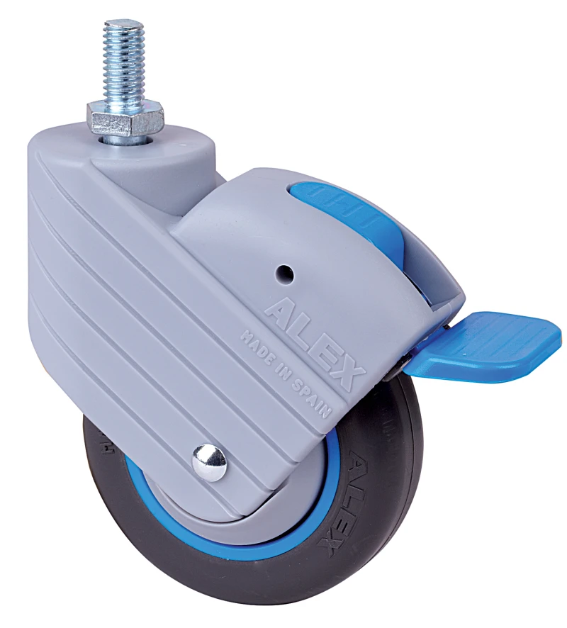Roues et roulettes en Poliamix et caoutchouc noir. Spécialement indiqué pour supporter des charges allant jusqu'à 40 Kg. Notre gamme de roues de la série HP-PGI est recommandée pour les secteurs de capacité de charge moyenne. Conçue pour présentoirs, meubles, tabourets, restauration, hôpitaux, outils, meubles sanitaires, cliniques, pieds à perfusion, chariots pour nettoyage.