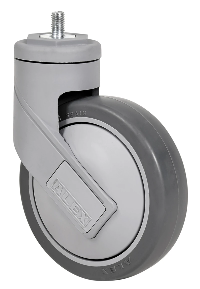 Roue en caoutchouc thermoplastique gris injecté. Support fabriqué en polyamide de haute qualité renforcé par de la fibre de verre. Tête supérieure pivotante construite sur un double chemin de billes renforcées (fixation sur plaque et à oeil) et roulement à billes inseré (fixation tige filetée).