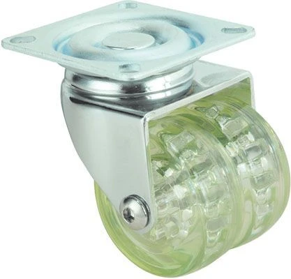 Matériau: Tôle d’acier.Finition: chromé poli.Fixations:Platine. Corps de rue en polycarbonate et double bandage en polyuréthane.Couleurs transparentes: bleu,vert. Disponible avec frein.