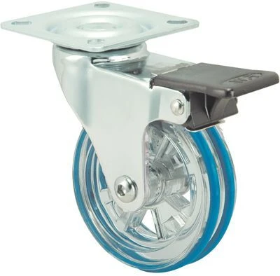 Matériau: Tôle d’acier.Finition: chromé poli.Fixations:Platine. Corps de roue en acrylique transparent et bandage en polyuréthane.Couleur: Rouge, jaune, orange, vert, bleu,noir. Disponible avec frein.