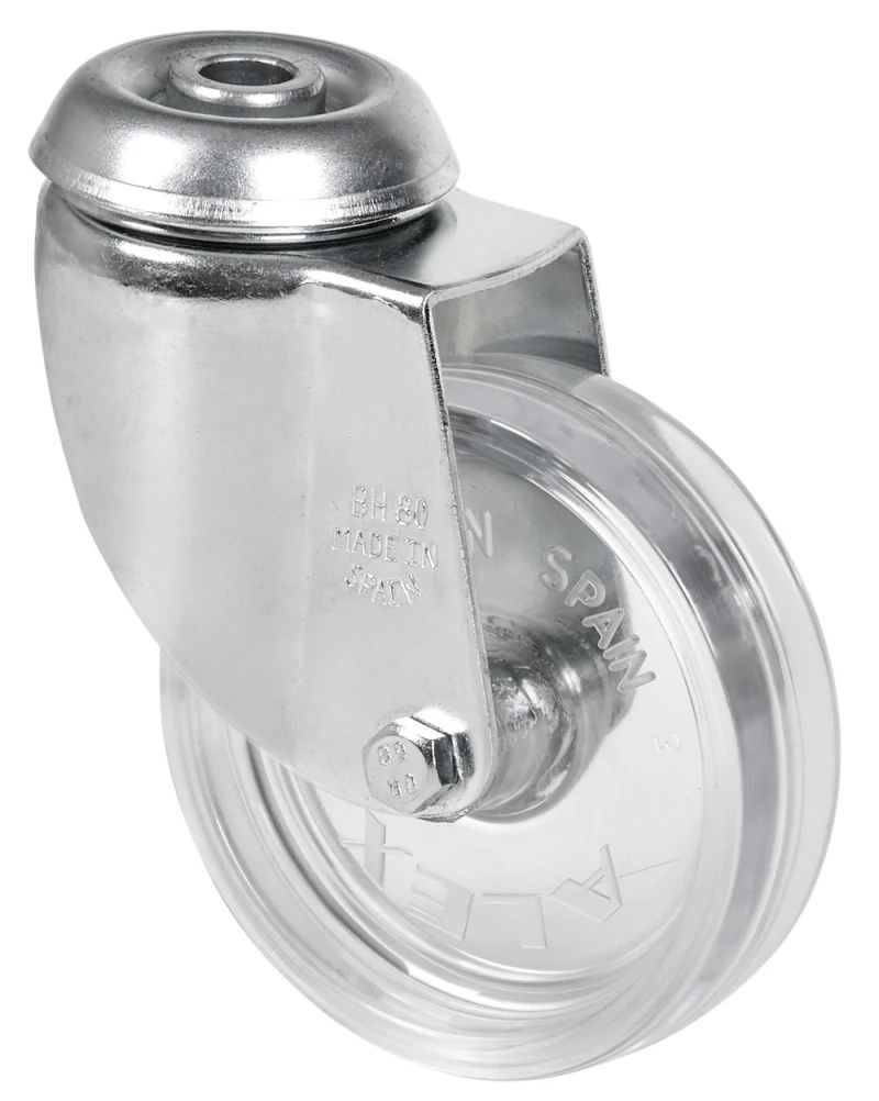 Tôle d’acier emboutie jusqu’à 2 mm d’épaisseur. Finition: galvanisé. Fixations: Platine et fixation à oeil ou à trou. Corps de roue en bois et bandage en caoutchouc,bandage en polycarbonate. Couleurs: hêtre, cerisier, cristal. Disponible avec frein.