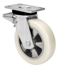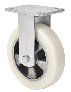 Roues avec noyau en aluminium et bande en polyuréthane blanc coulé d'une dureté de 88 shores A, particulièrement adaptées pour supporter des charges élevées jusqu'à 650 kg.