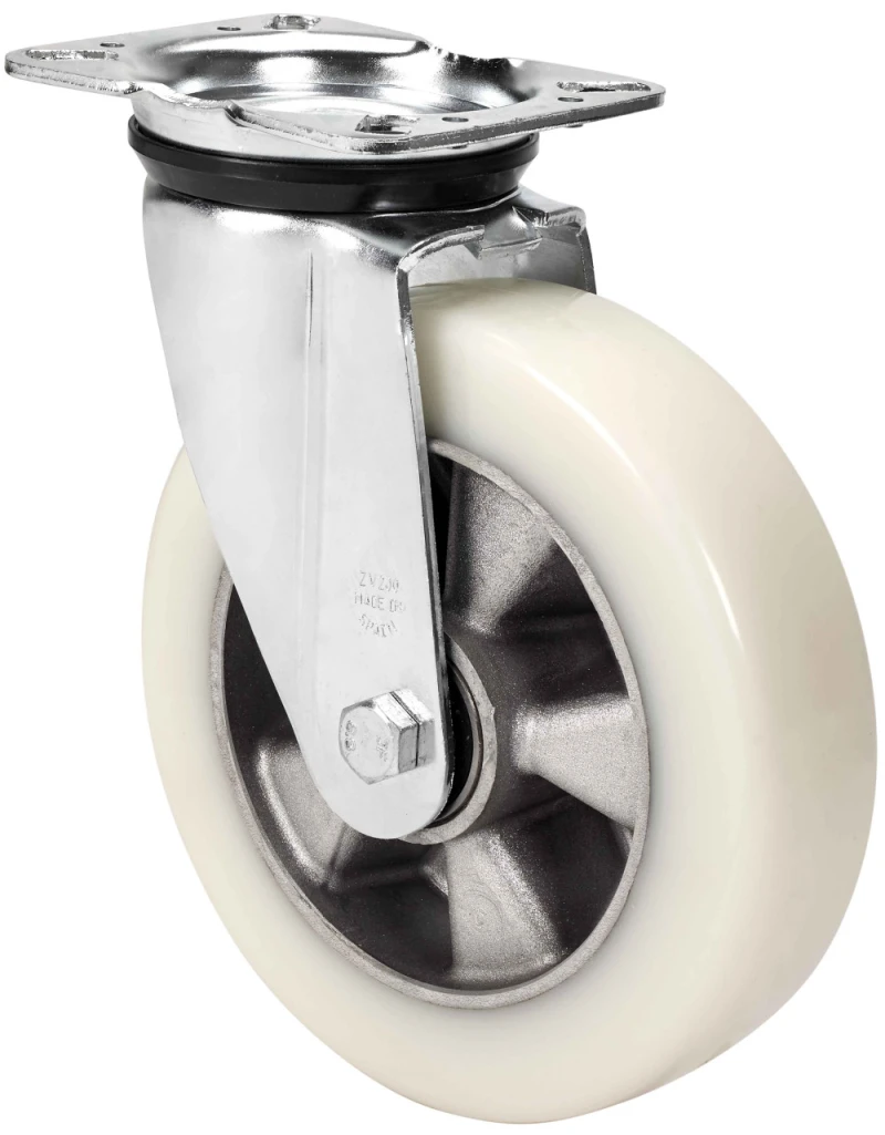 Roues et roulettes avec noyau en aluminium et bande de polyuréthane dure blanche à 88º shore. Particulièrement indiquées pour supporter des charges allant jusqu'à 650 kg.