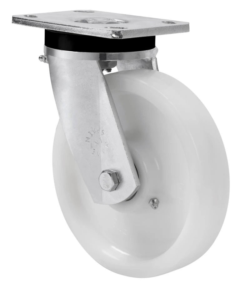 Roulettes en nylon extra-robustes, indiquées spécialement pour supporter de fortes charges jusqu'à 1 000 kg.