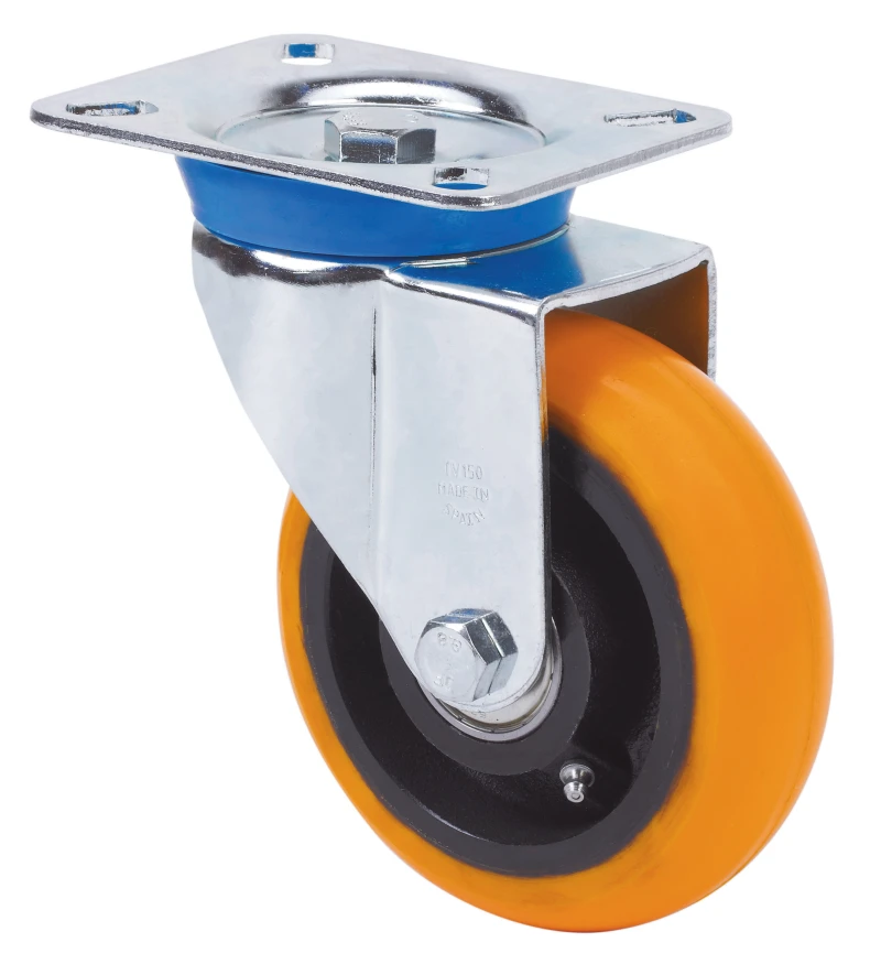 Roulettes à noyau en acier et bande de polyuréthane fondu d'une dureté 95º shore A avec une bande de roulement en forme de balona, spécialement indiquées pour supporter de fortes charges jusqu'à 800 kg.