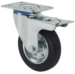 Roulettes à noyau central métallique avec bande de caoutchouc noir. Indiquées spécialement pour supporter des charges jusqu'à 250 Kg. Utilisées pour des chariots d'outillages, chariots tubulaires, logistique interne, gradins mobiles, outils de transport, plateformes élévatrices, ateliers, missions de transport de matériel et logistique, restaurants, balayeuses, poulisseuses, machines à souder, betonnières, grues mobiles, remorques, fermes agricoles, tables élévatrices, roll-palets, roll-tainers, conteneurs.