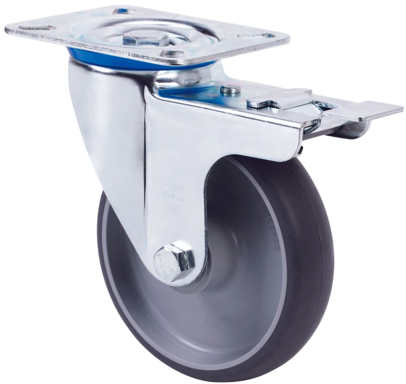 Roulettes en caoutchouc gris injecté à noyau en polypropylène. Indiquées spécialement pour supporter des charges jusqu'à 180 kg.