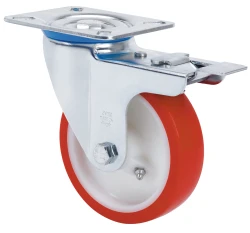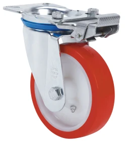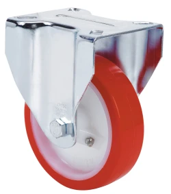 Roulettes à noyau en nylon blanc et bande de polyuréthane injecté rouge de dureté 90-95º shore A. Indiquées spécialement pour supporter des charges jusqu'à 400 kg.