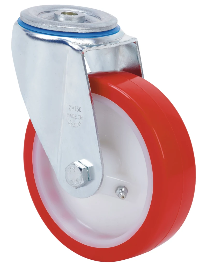 Roulettes à noyau en nylon blanc et bande de polyuréthane injecté rouge de dureté 90-95º shore A. Indiquées spécialement pour supporter des charges jusqu'à 400 kg.