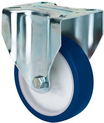 Roulettes à noyau en polypropylène blanc et bande en polyuréthane bleu injecté doux avec dureté de 80º shore A. Indiquées spécialement pour supporter des charges jusqu'à 250 kg.