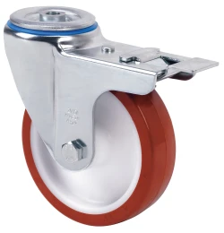 Roulettes à noyau en polypropylène blanc et bande en polyuréthane brun injecté d'une dureté de 95º shore A. Indiquées spécialement pour supporter des charges jusqu'à 300 kg.