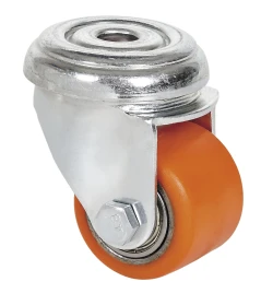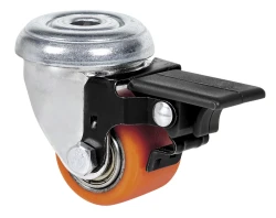 Roues à corps métallique et bandage en polyuréthane coulé d’une dureté 95 shore A. Particulièrement indiquée pour supporter des charges jusqu’à 100 kg avec une hauteur minimale.