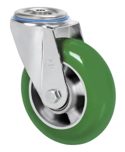 AUAGB:Roue avec bande de roulement arrondie. Moins d'effort de rotation et de déplacement. Polyuréthane vert avec grande capacité de charge.