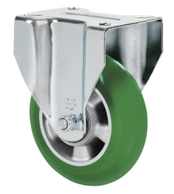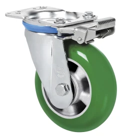 Roues avec centre en aluminium et bande de roulement arrondie en polyuréthane vert d'une dureté 80º Shore A. Patriculièrement adaptées pour supporter des charges allant jusqu'à 650 Kgs.