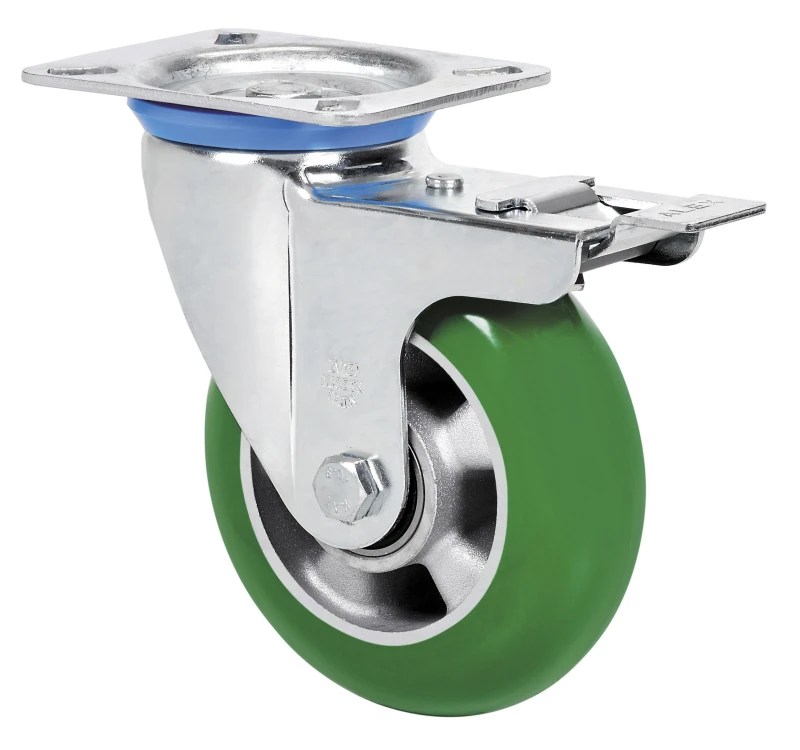AUAGB:Roue avec bande de roulement arrondie. Moins d'effort de rotation et de déplacement. Polyuréthane vert avec grande capacité de charge.