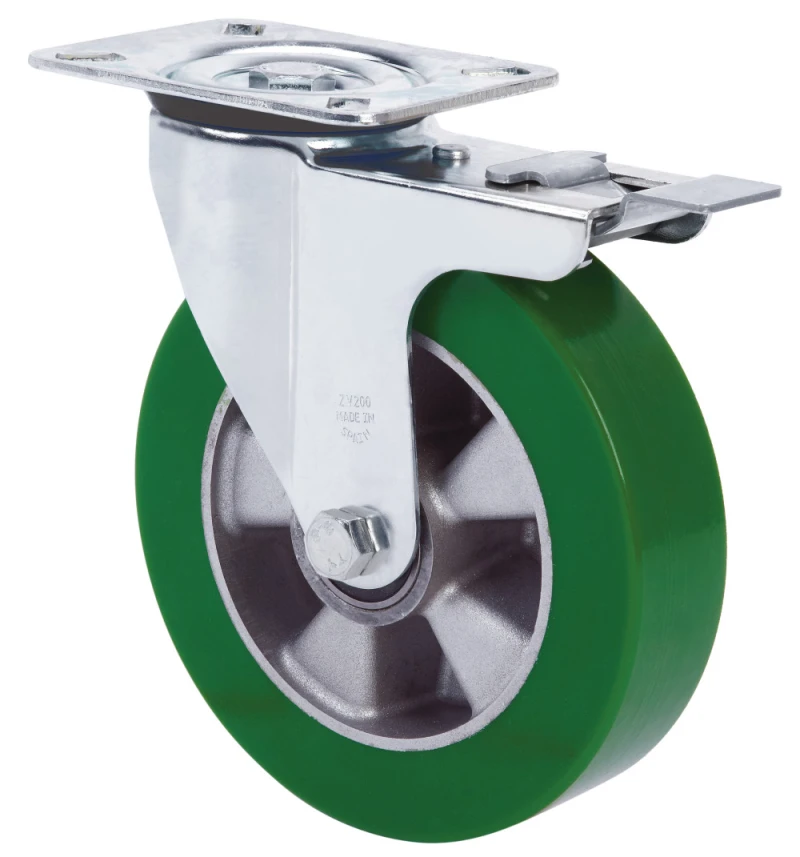 Roues avec moyeux en aluminium et bande de polyuréthane verte de dureté Shore A de 80º. Particulièrement indiqué pour supporter des charges allant jusqu'à 700 kg.